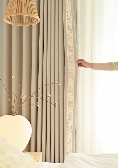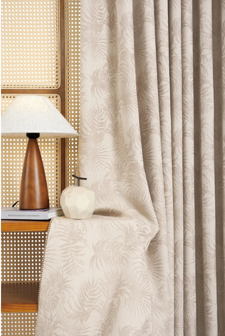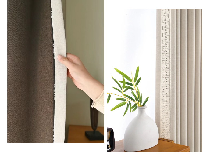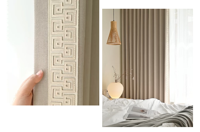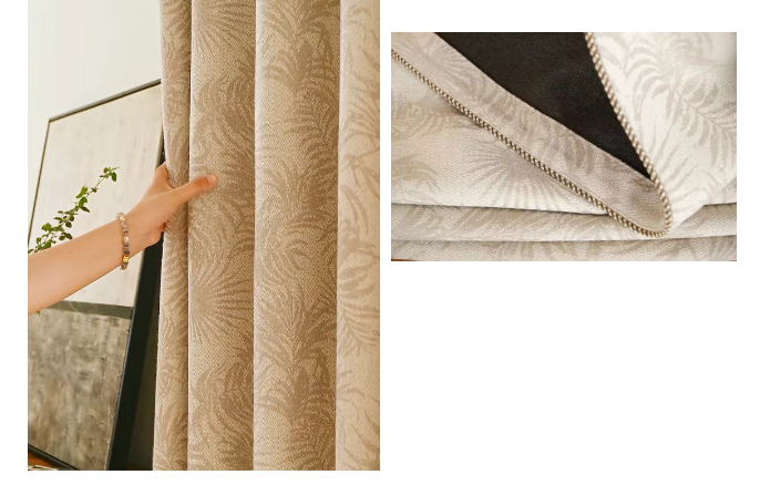 80%遮光率留足了「光影游戲」的空間午后陽光穿過雪尼爾絨紗葉片花紋在地面投下斑駁的影像極了宋人在庭院里看「疏影橫斜」的閑趣側邊深咖色絨繩如畫龍點睛的飛白筆讓整體多了份「不經意的精致」